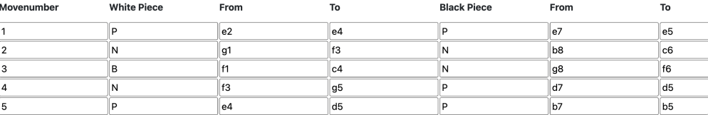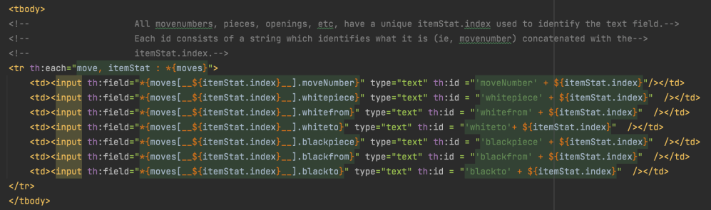 Each empty new move row is filled in when the player makes a move on the board. I utilized javascript in handling played board moves and binding Spring form input data to the opening object model. Each move has a unique itemStat index. The idea is that when we move a piece on the board twice, we know a move has passed and that the next move played on the board is represented by the next row of fields on the form.