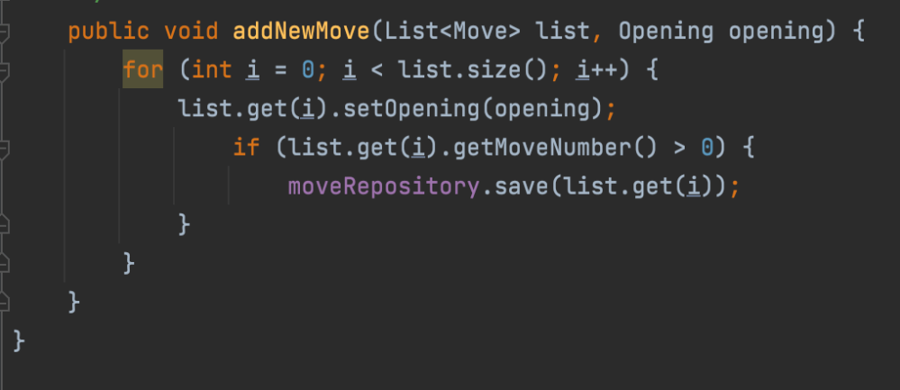“Form.getMoves” returns a list of moves from the opening. The moveService loops through form and adds one move at a time to the table. The player is then redirected to the List page, a view where the player can see their updated repertoire. Below we can see how the addNewMove function loops and each move is added to the table by the moveRepository: