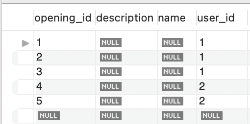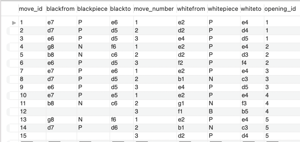 There are three tables: a User table, an Opening table, and a Move table. The User table has a one-to-many relationship with the Opening table; the Opening table has a one-to-many relationship with the Move table. For example, User with user_id 1 has three openings in the database, the openings with opening_id 1, 2, and 3. The opening with id 1 contains three moves with move_id 1, 2, and 3: