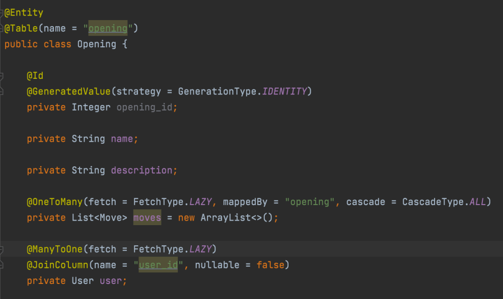 The Opening Java class, for instance, is matched to the opening table and its one-to-many relationship with the move class, as well as its many-to-one relationship with the User class, are denoted with Spring annotations so that Hibernate can properly transfer information to and from the MySQL database: