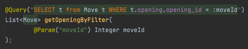 The moveService.findMovesByOpeningId invokes a Query I manually wrote in the repository to get all moves that share an opening_id: this is actually an inner join statement: