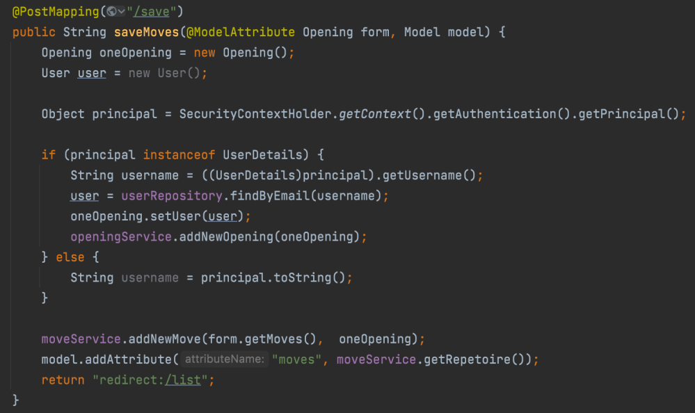 Let’s take a look at one of the controllers for the MVC architecture. Below we can see the PostMapping for the /save endpoint. The Opening form, which contains a list of initially empty moves, is sent to the Thymeleaf front-end where it is filled out when a player plays moves on the chess board and submits the form. A new opening is created and the moves and opening are added to the Moves table by the MoveService class, moveService.addnewmove. The openingService creates a new opening for the corresponding moves and corresponding user, after checking which user is logged into the session.