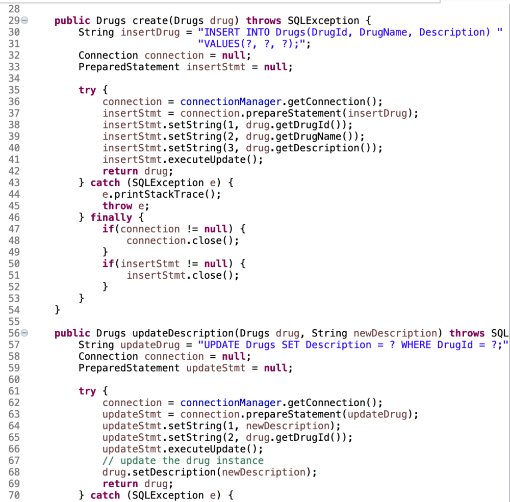 Servlet controller classes exist for each endpoint and rely on the functions of the DAO of the model layer. FindDrugs class is one such controller.