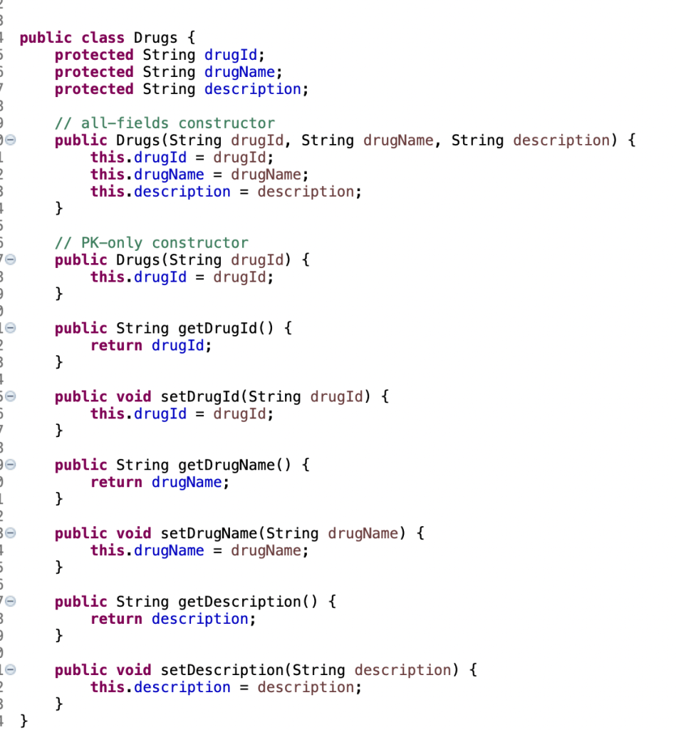 The Drugs data transfer object class and DrugsDAO class, for instance, are part of the Model Layer
