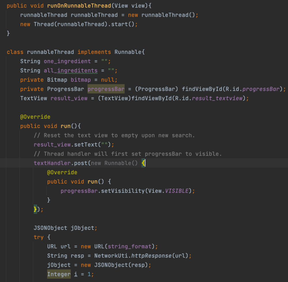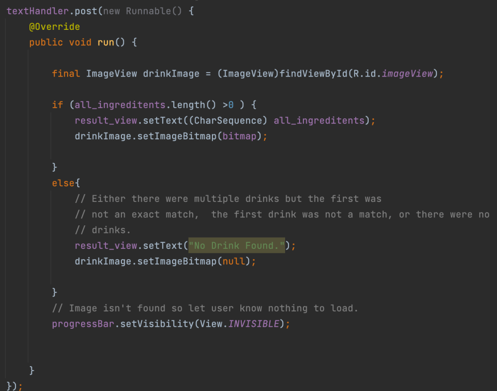The parsing and calculations depicted in the prior section were complete in a separate thread from the main Android UI thread, which is standard practice to alleviate the load on the UI thread where UI related calculations take place. The progressbar code is located in this separate thread as well: the animation starts before the parsing, and once the parsing is complete, it ends. Below, textHandler.post ensures that the UI thread performs the alteration, as UI widgets can only be modified from the UI thread.