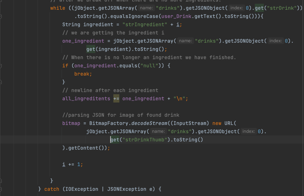 I utilized a public API’s (see https://www.thecocktaildb.com/api.php) JSON endpoints to retrieve drink ingredients and images so that users may view find out how to create a searched cocktail. After retrieving a GET request from the API, I was able to convert the response using stringBuilder. In order to then parse the JSON format, I used the org.json library. This was great practice for using an API. I have built my own API in the past, but the respones were sent to the Thymeleaf front-end; I never exploited JSON endpoints in my own projected. You can see below that the JSON object actually contained a JSONArray of JSONObjects, so there was a good deal of parsing.